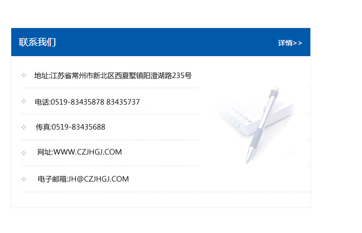 地址:常州市新北區友邦商務大廈1幢16、17層  電話:0519-85101652  傳真:0519-85112595  郵編:213022  網址:www.cz-jiayue_cn.zhsjrh.com  郵箱:xiajifengaa@163.com